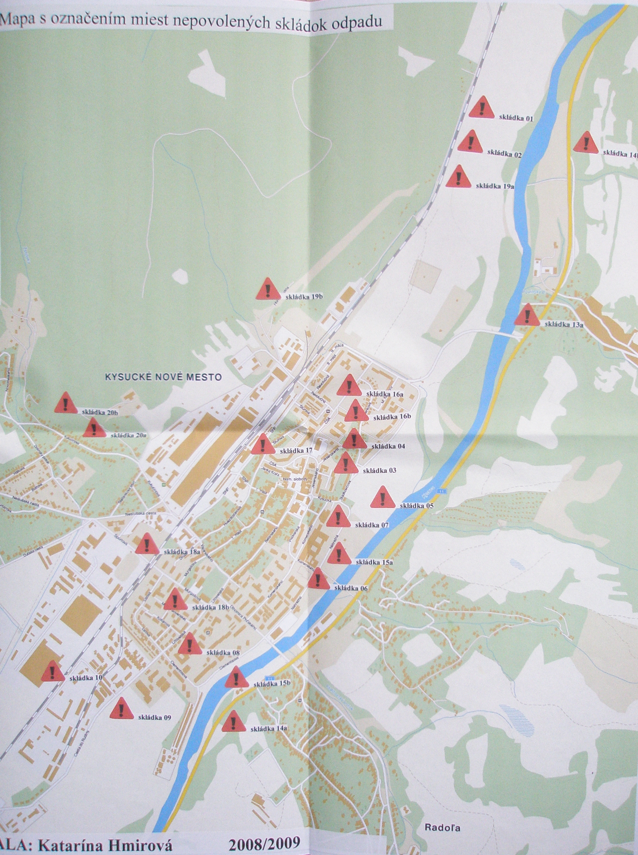 Na mape sa nachádzajú zaznamenané miesta výskytu čiernych skládok v Kysuckom Novom Meste aj s časom zaznamenania. Pre názornejšie zobrazenie je vhodné si mapku stiahnuť.
